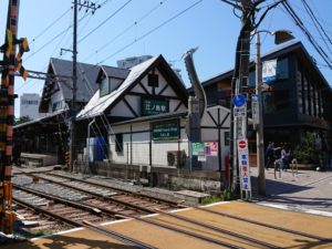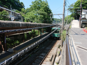 江ノ島駅から鎌倉方面へ出発して、狭い片路線が民家の隙間を縫うように進みますが、