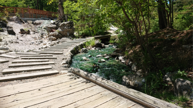 鮮やかなエメラルドグリーンは、源泉から含まれる鉱物が強く豊富であることが見た目でよくわかりました。